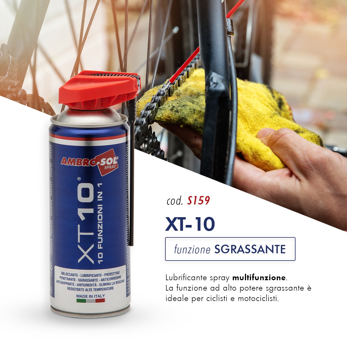 Il lubrificante sbloccante XT-10 Ambro-Sol è particolarmente indicato per l’utilizzo in ambito automobilistico, motociclistico, industriale e domestico, risultando ideale per la manutenzione di bulloni, dadi, cerniere, serrature, ingranaggi, catene e componenti meccanici soggetti a usura o ossidazione.
