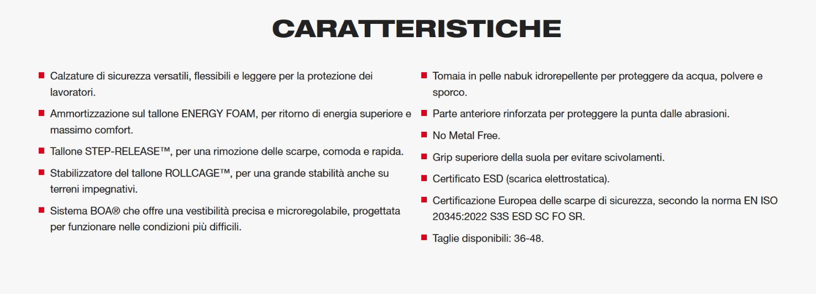 La certificazione S3S rende queste scarpe antinfortunistiche Milwaukee adatte agli ambienti di lavoro dove sono richiesti elevati standard di protezione. La presenza della protezione ESD aiuta a dissipare le cariche elettrostatiche, caratteristica particolarmente utile in contesti tecnici e professionali. La suola con requisiti FO SR SC offre una buona resistenza agli oli e maggiore aderenza sulle superfici, contribuendo a migliorare la sicurezza nei movimenti.