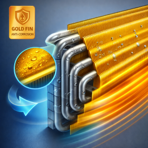 - Trattamento anticorrosione Gold Fin : Lo scambiatore con rivestimento Gold Fin protegge l’unità interna ed esterna dalla corrosione e dagli agenti atmosferici, migliorando la durata del climatizzatore nel tempo.