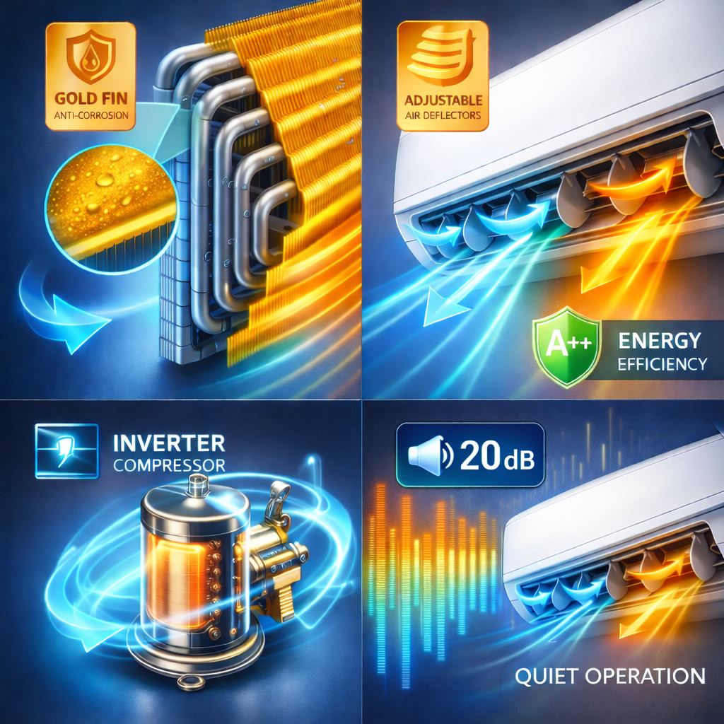 Il climatizzatore è dotato di scambiatore di calore con trattamento anticorrosione Gold Fin, una tecnologia progettata per proteggere le batterie interne dall’umidità, dalla corrosione e dagli agenti atmosferici. Questo rivestimento speciale aumenta la durata dello scambiatore e migliora l’affidabilità del sistema nel tempo, rendendo il climatizzatore particolarmente adatto anche per installazioni in ambienti umidi o esposti a condizioni climatiche difficili.