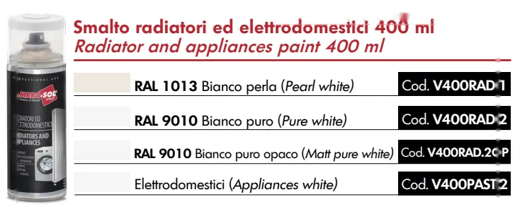 Elettrodomestici (Appliances white), RAL 1013 Bianco perla (Pearl white), RAL 9010 Bianco puro (Pure white), RAL 9010 Bianco puro opaco (Matt pure white)